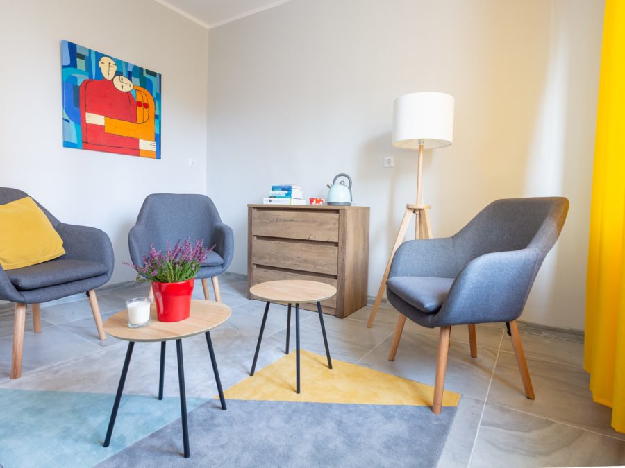 Gabinet o powierzchni ok. 10 m kw. Wyposażony w 3 fotele, 2 stoliki oraz komodę. Do dyspozycji specjalistów oraz klientów są: czajnik, koce oraz pufa i poduszki.   Cena: 350,- zł netto miesięcznie za dzień w tygodniu.