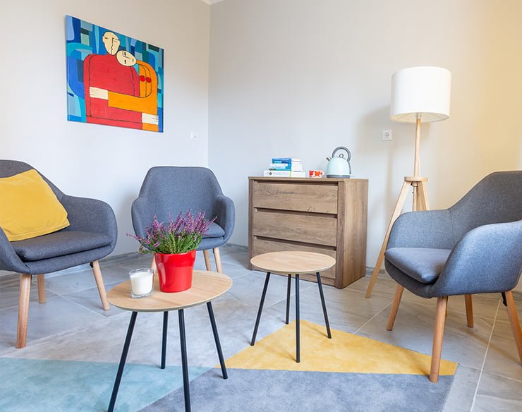 Gabinet o powierzchni ok. 10 m kw. Wyposażony w 3 fotele, 2 stoliki oraz komodę. Do dyspozycji specjalistów oraz klientów są: czajnik, koce oraz pufa i poduszki.